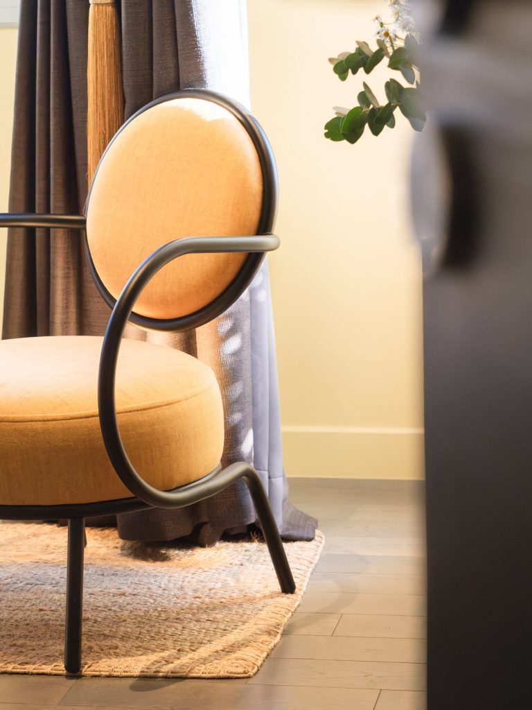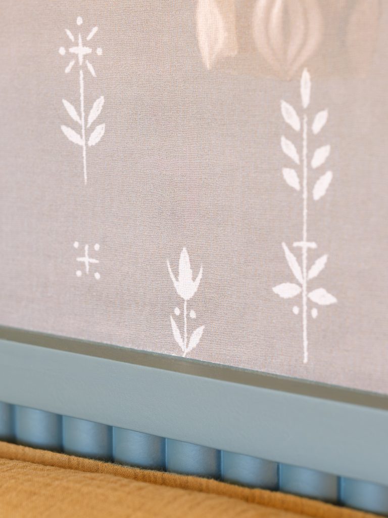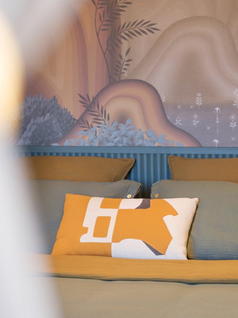 Les textiles, les finitions murales et les éléments décoratifs ont été sélectionnés pour leur richesse visuelle et tactile, renforçant l’ambiance feutrée et sensorielle de la pièce.
