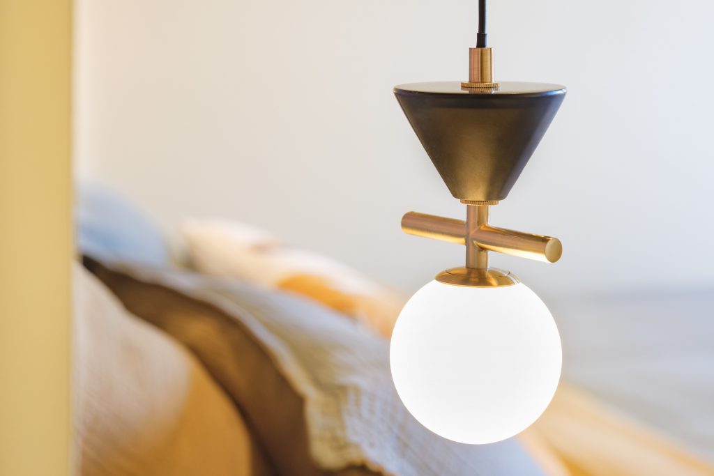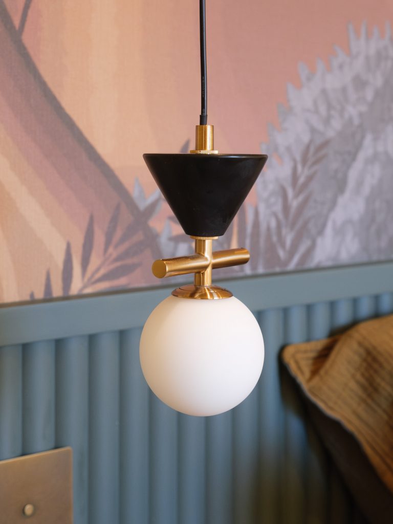 Les appliques murales noires à l’esthétique industrielle ont été remplacées par des suspensions modernes en marbre et laiton, apportant une touche plus raffinée et intemporelle.