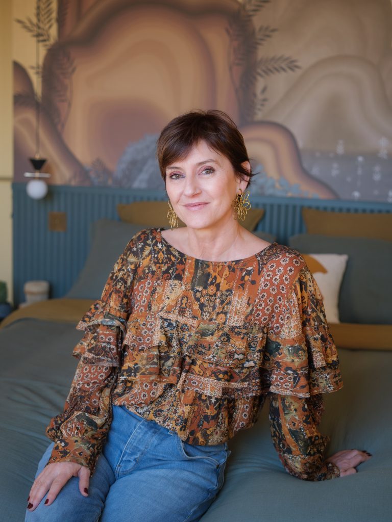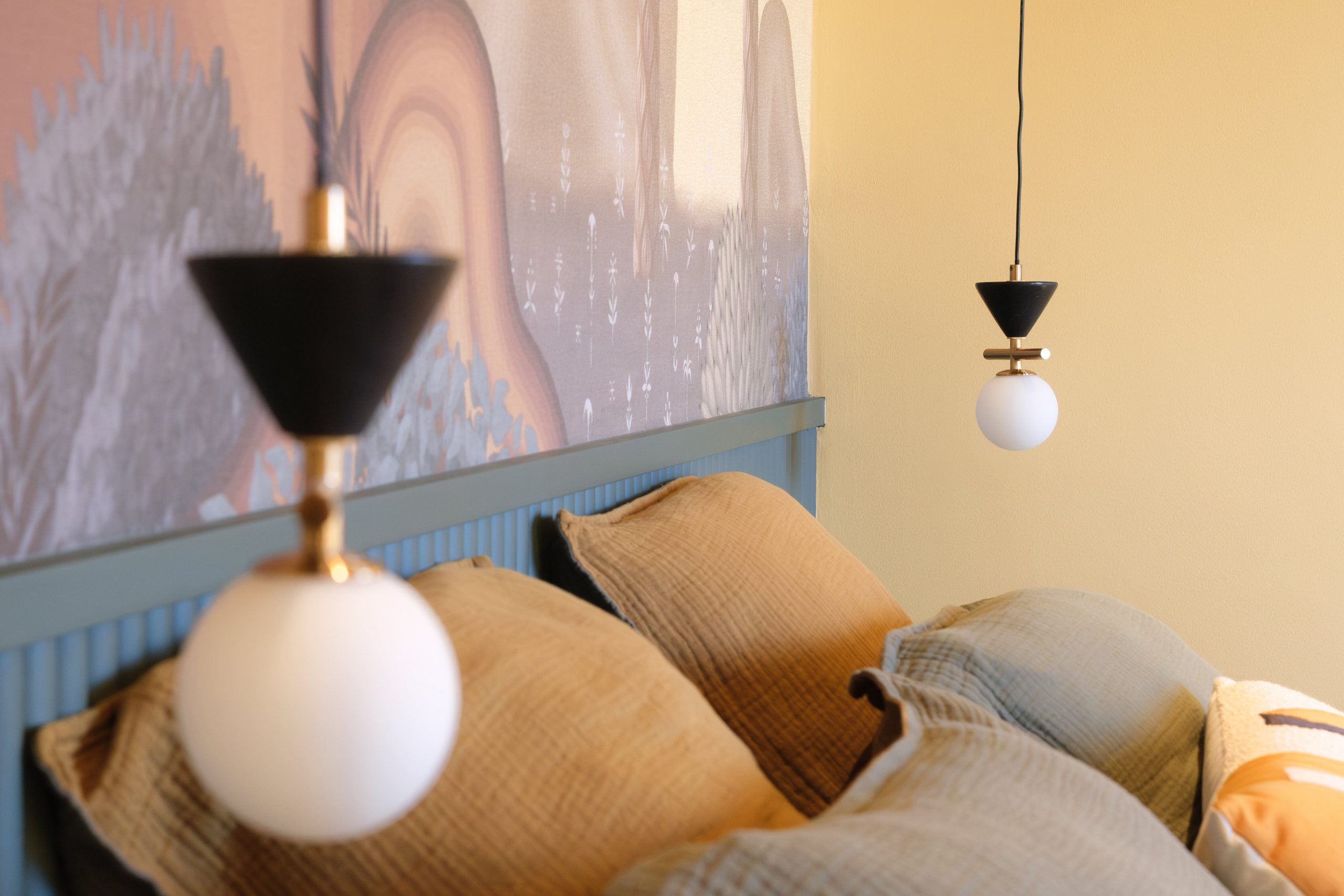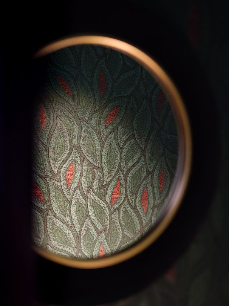 Le papier peint panoramique haut de gamme joue un rôle central dans l’identité du lieu. Son revêtement intissé associe la subtilité de reflets dorés délicats — une tonalité rarement utilisée dans mes projets — à des motifs mats plus contemporains, créant un équilibre entre sophistication et modernité.