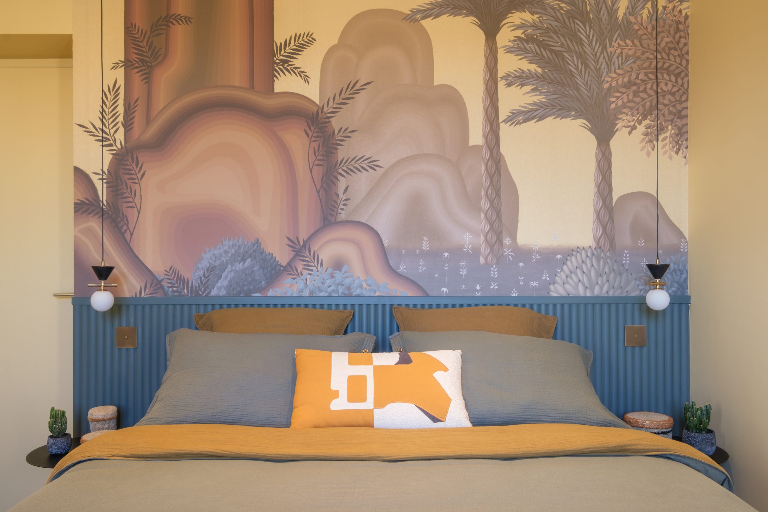 À l’origine, la chambre était blanche, froide et ponctuée de noir, sans véritable identité. La rénovation a introduit une palette colorimétrique ensoleillée, apportant chaleur et profondeur. Les teintes choisies dialoguent avec la lumière naturelle et renforcent l’esprit chambre d’hôtel haut de gamme recherché.