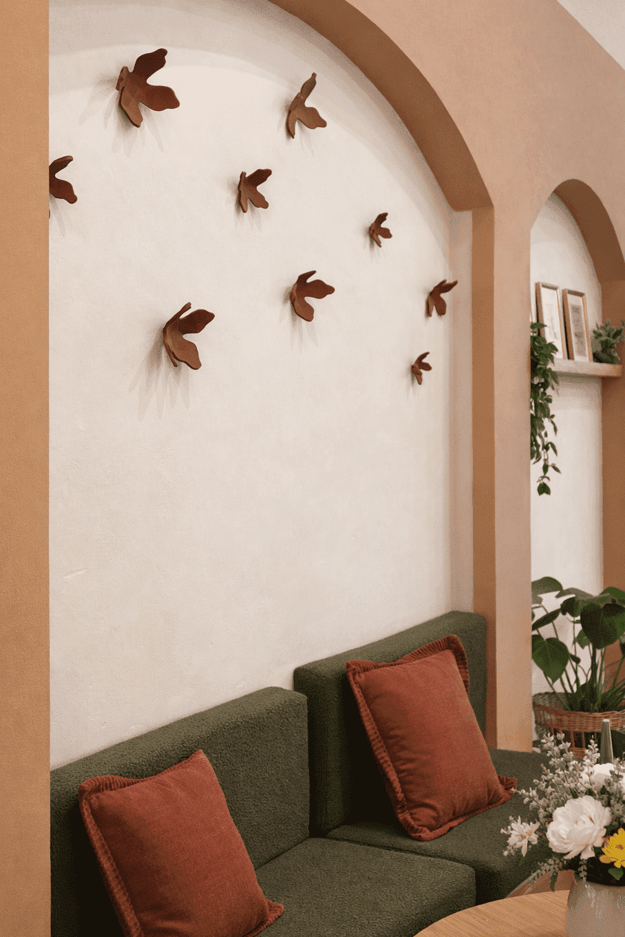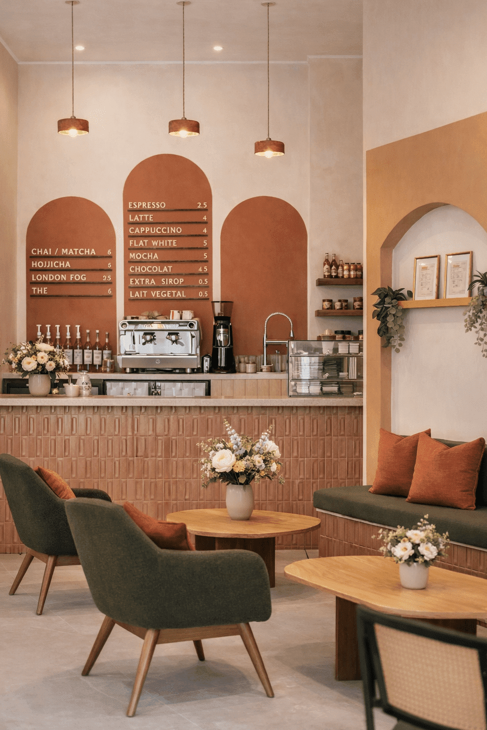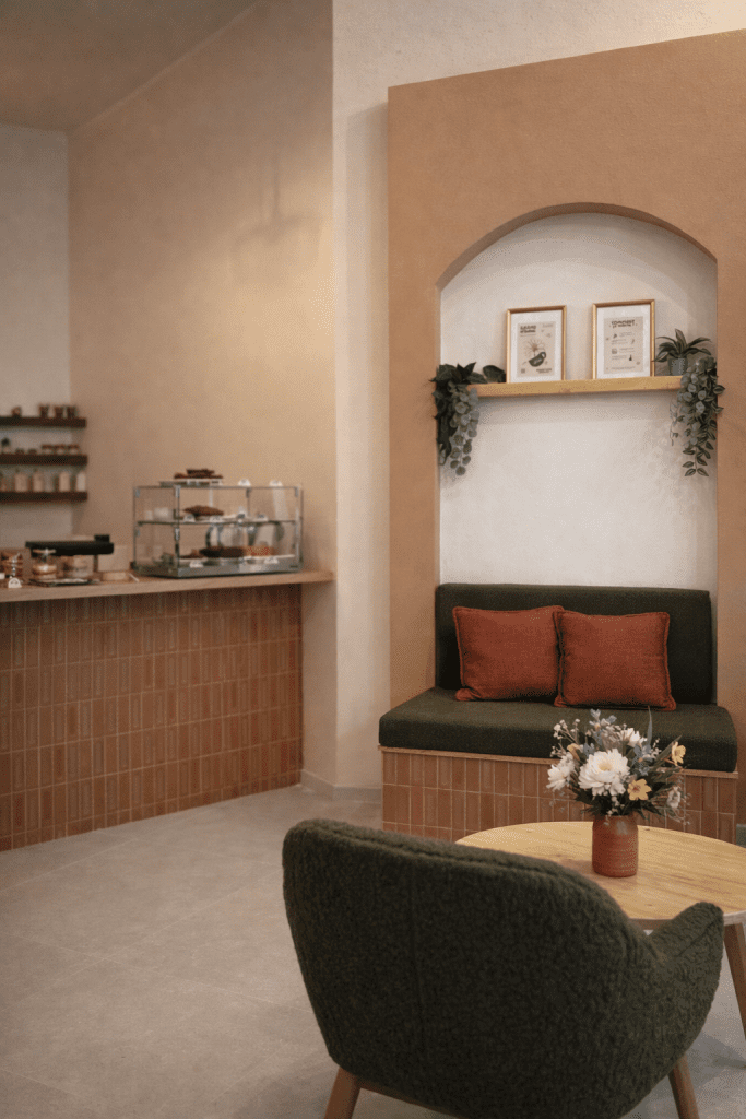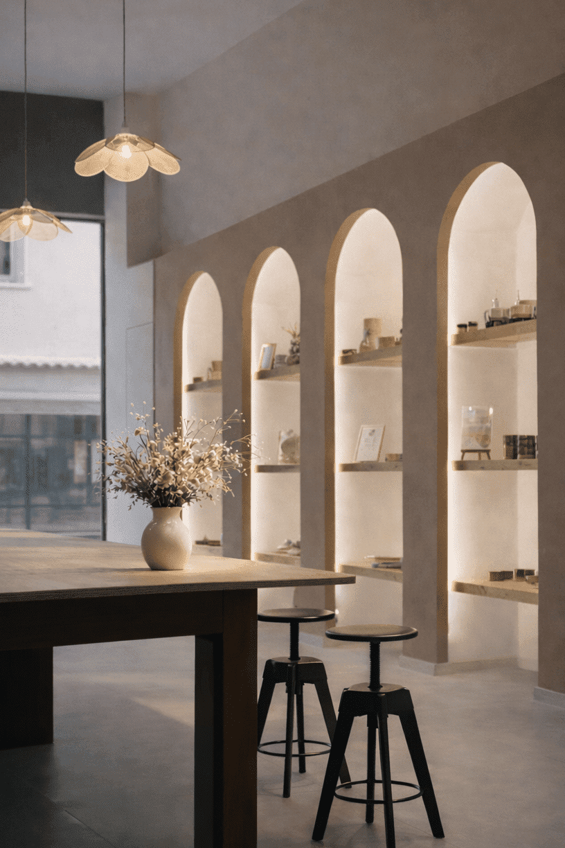 Dans l’espace accessible au public, un bar sur mesure, une banquette intégrée et des arches architecturales participent à la mise en valeur des créations en céramique et à la création d’une expérience client fluide et chaleureuse.