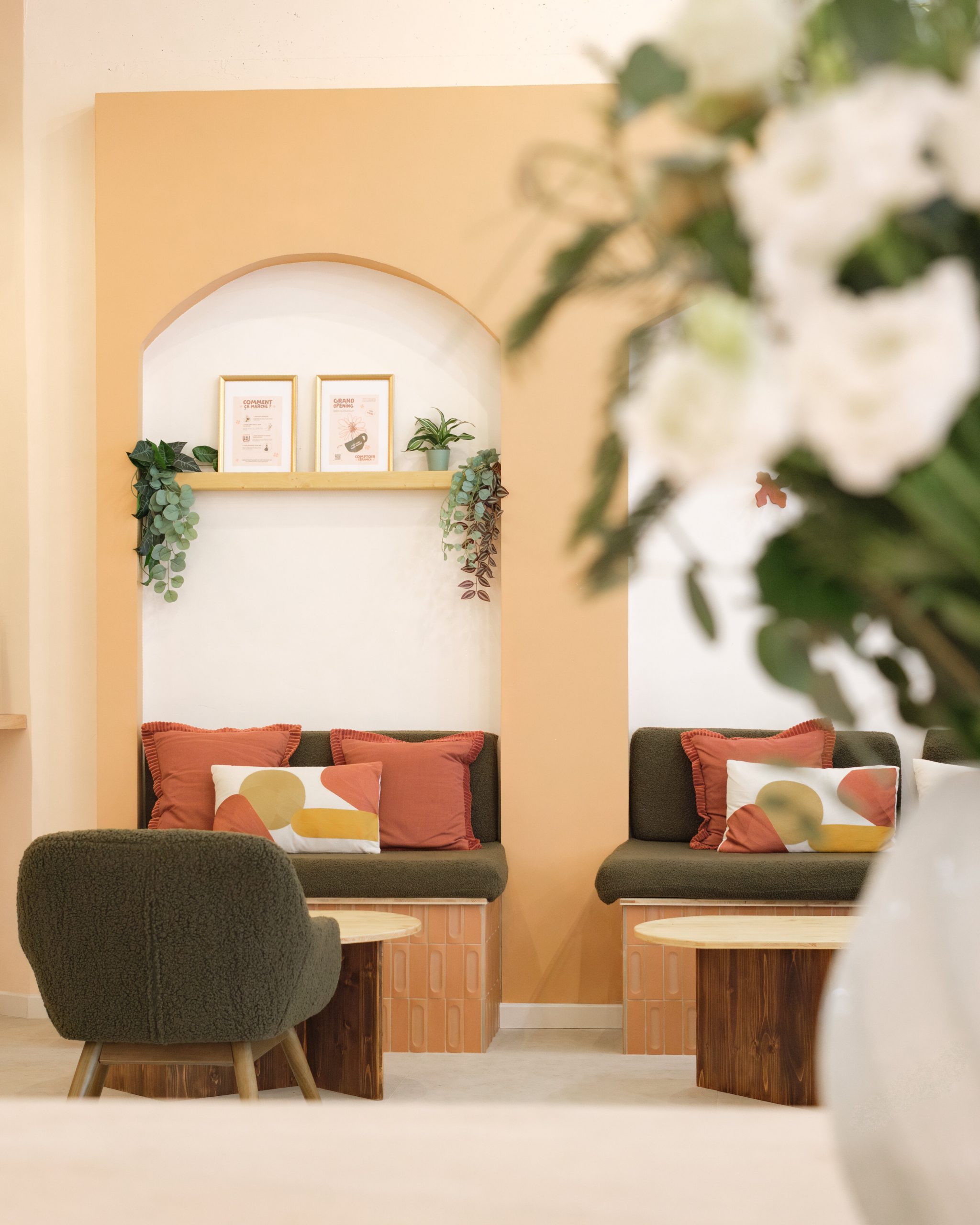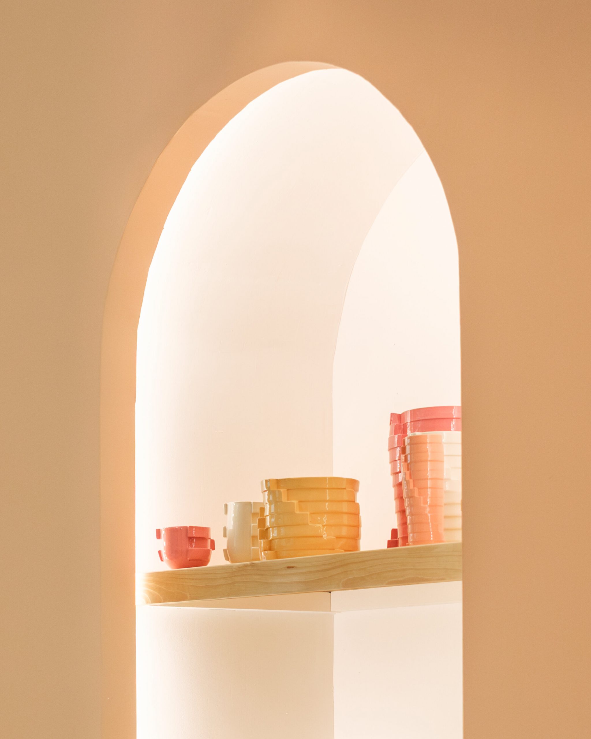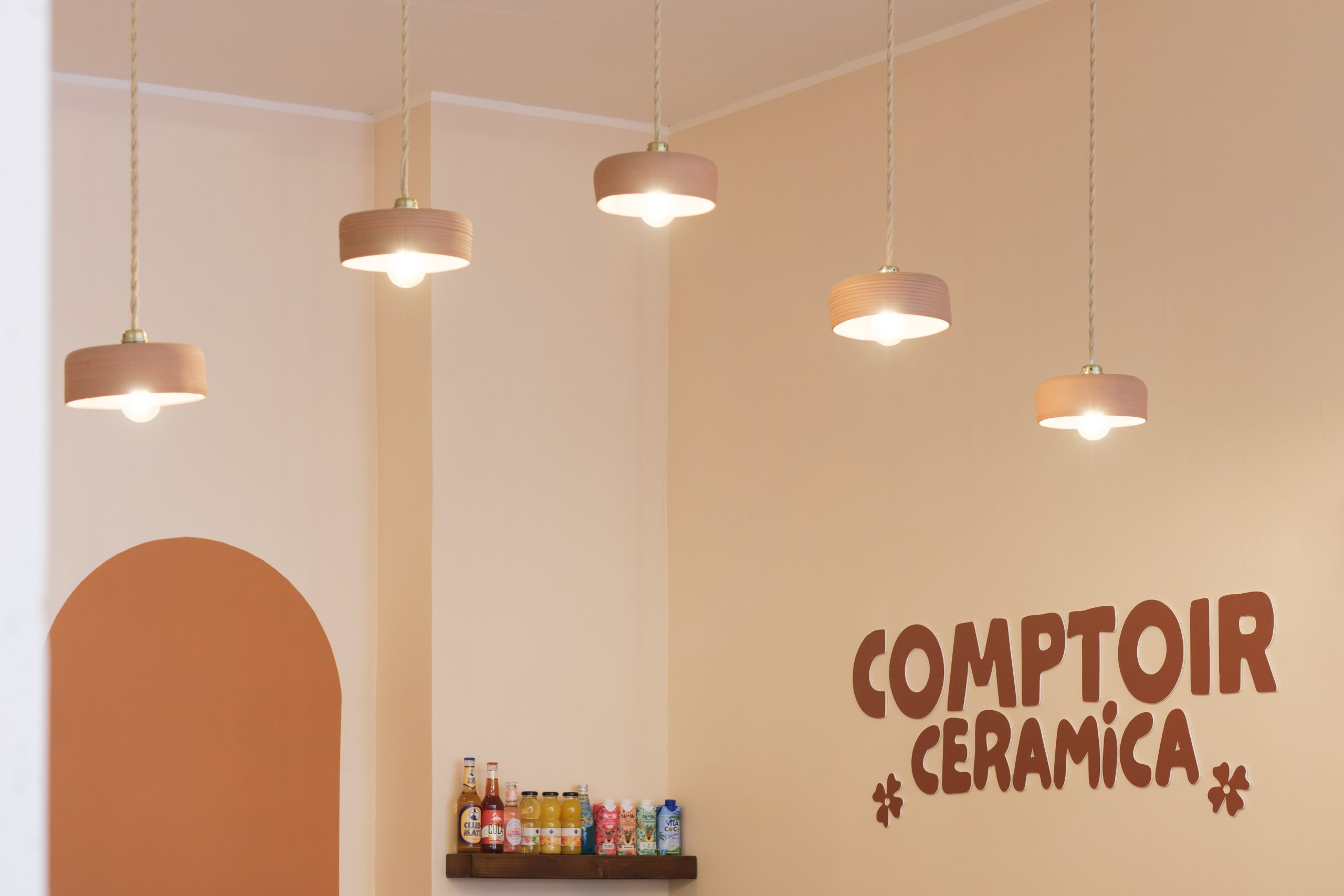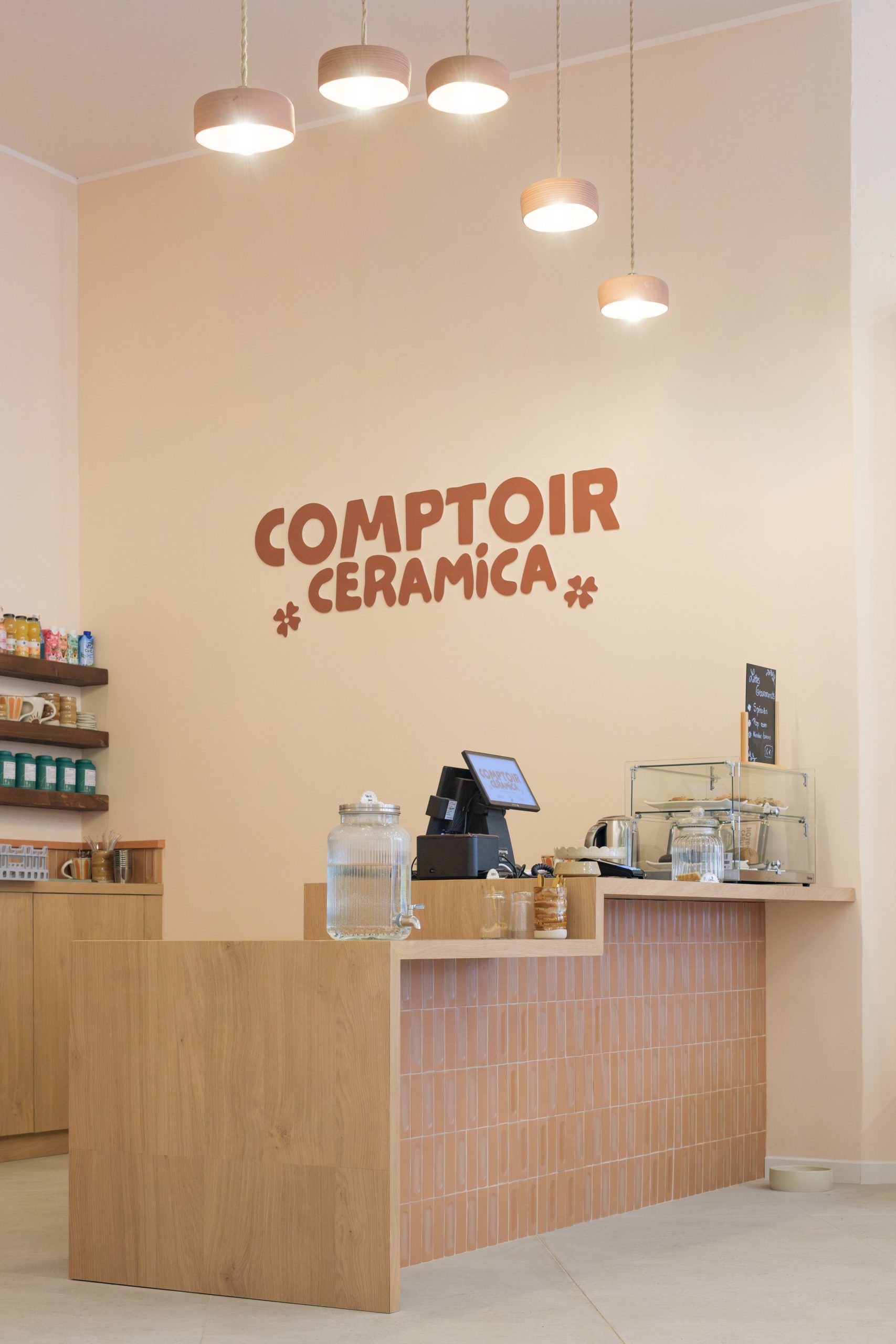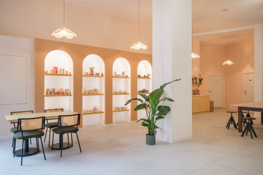 Dans l’espace accessible au public, un bar sur mesure, une banquette intégrée et des arches architecturales participent à la mise en valeur des créations en céramique et à la création d’une expérience client fluide et chaleureuse.