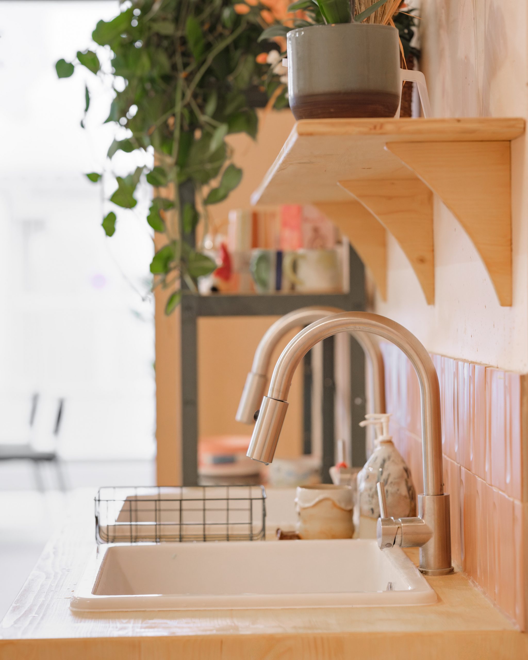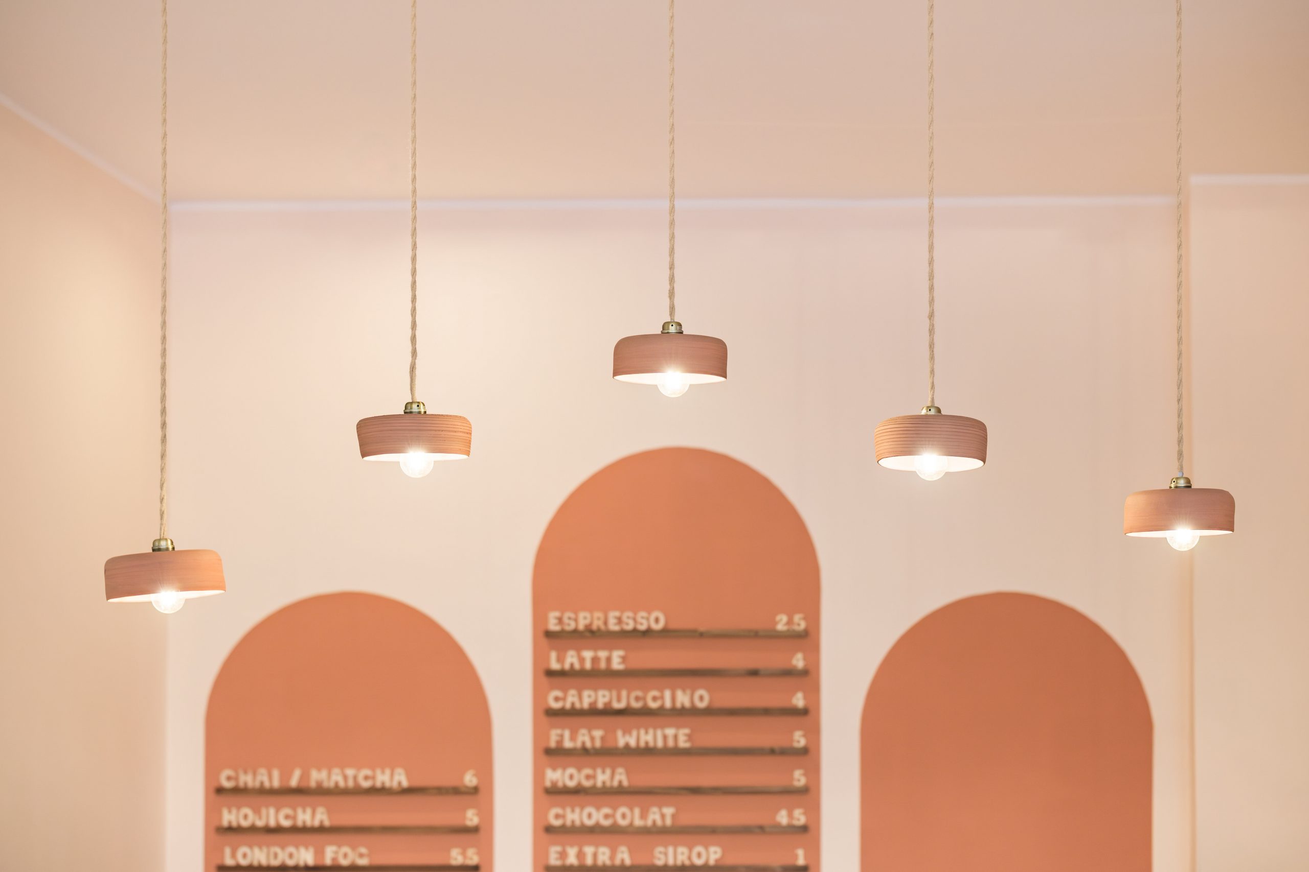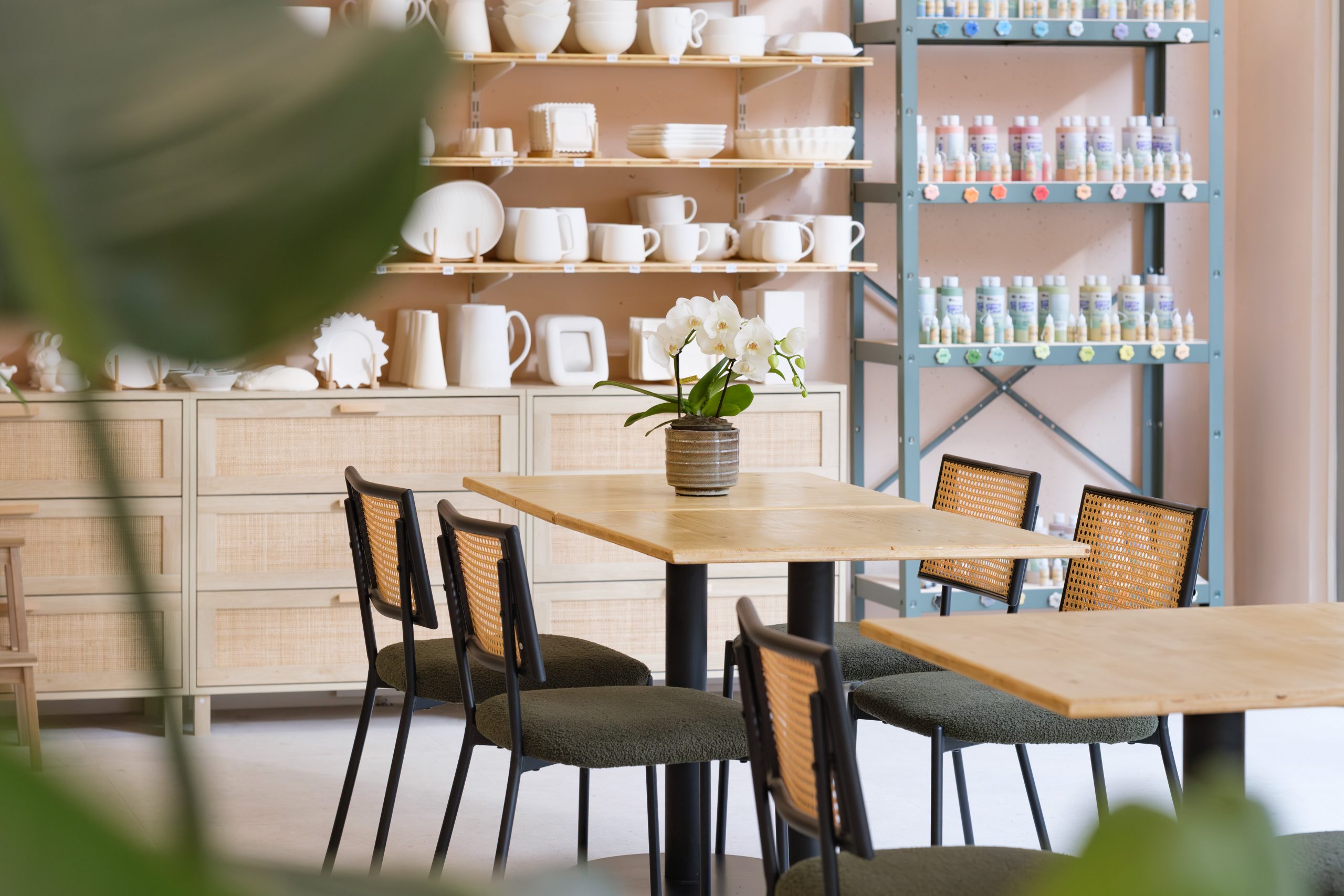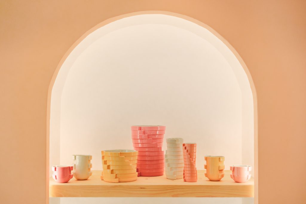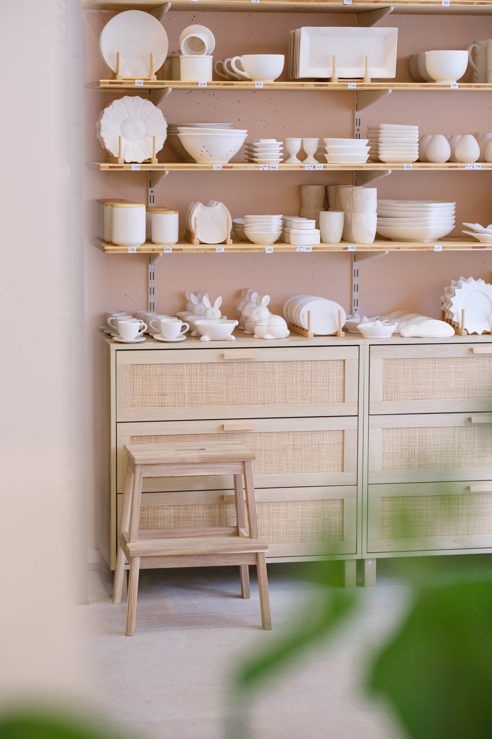 Dans l’espace accessible au public, un bar sur mesure, une banquette intégrée et des arches architecturales participent à la mise en valeur des créations en céramique et à la création d’une expérience client fluide et chaleureuse.