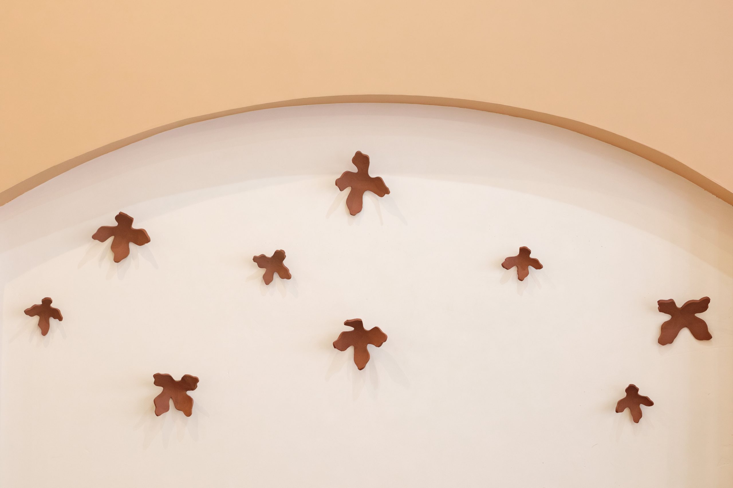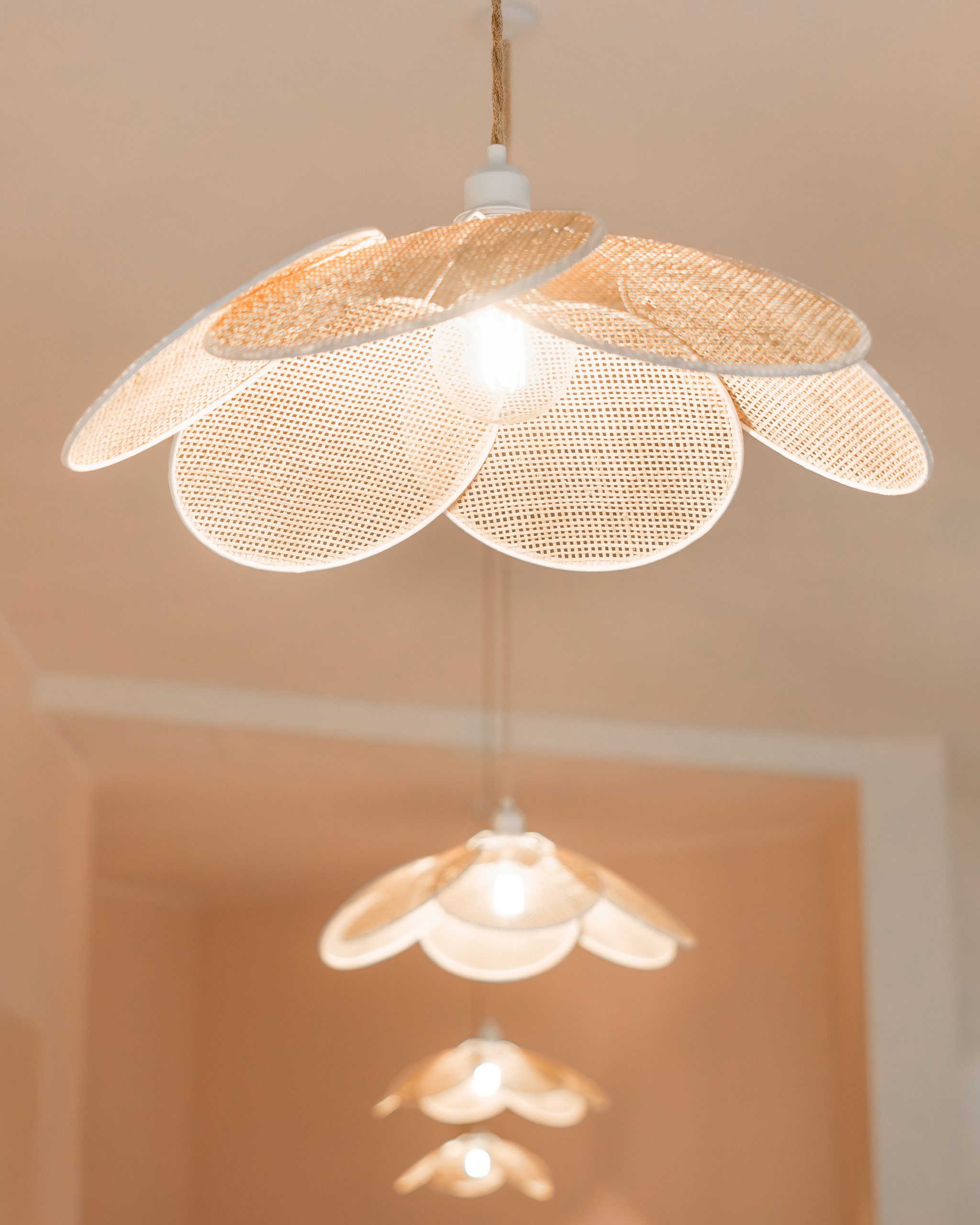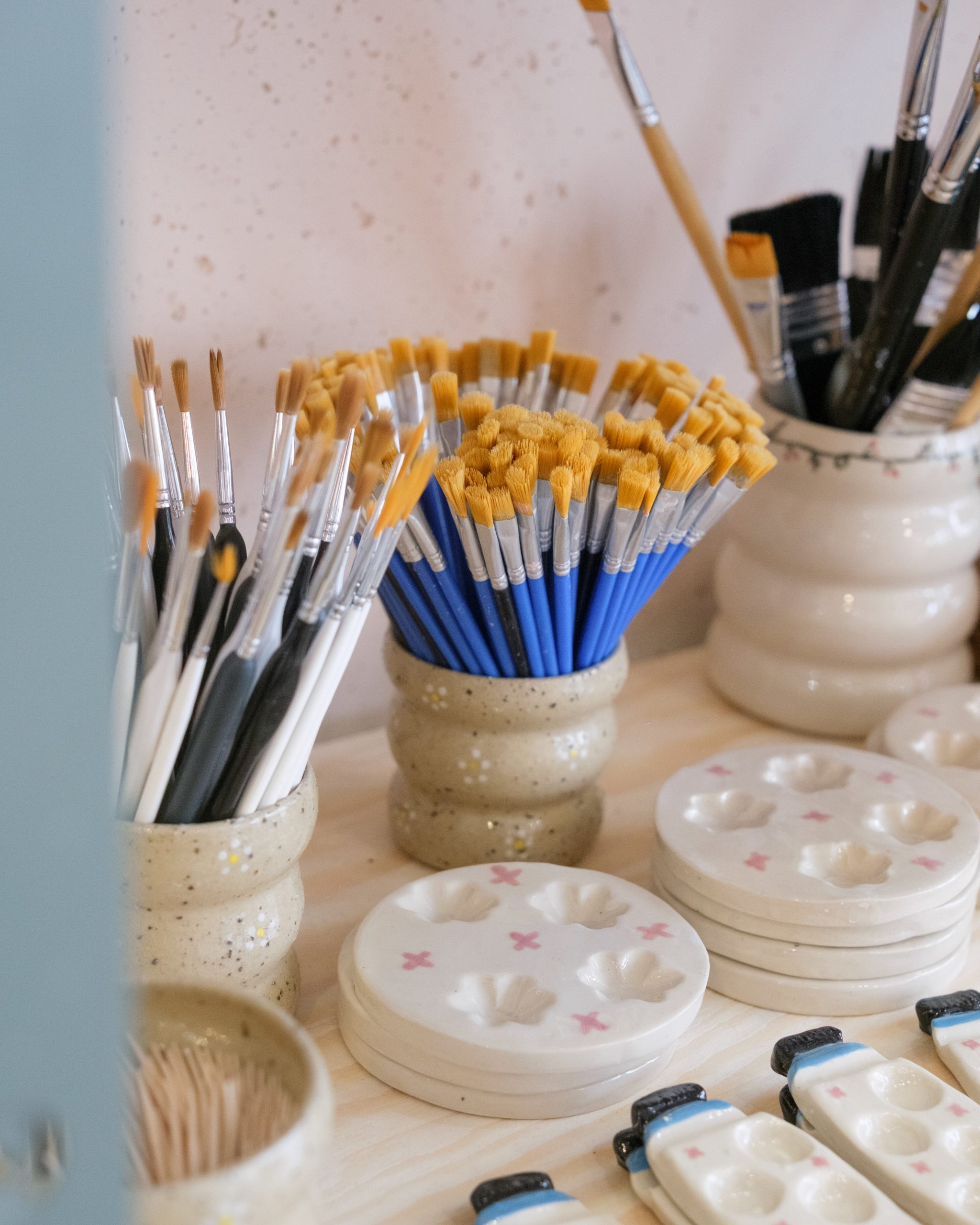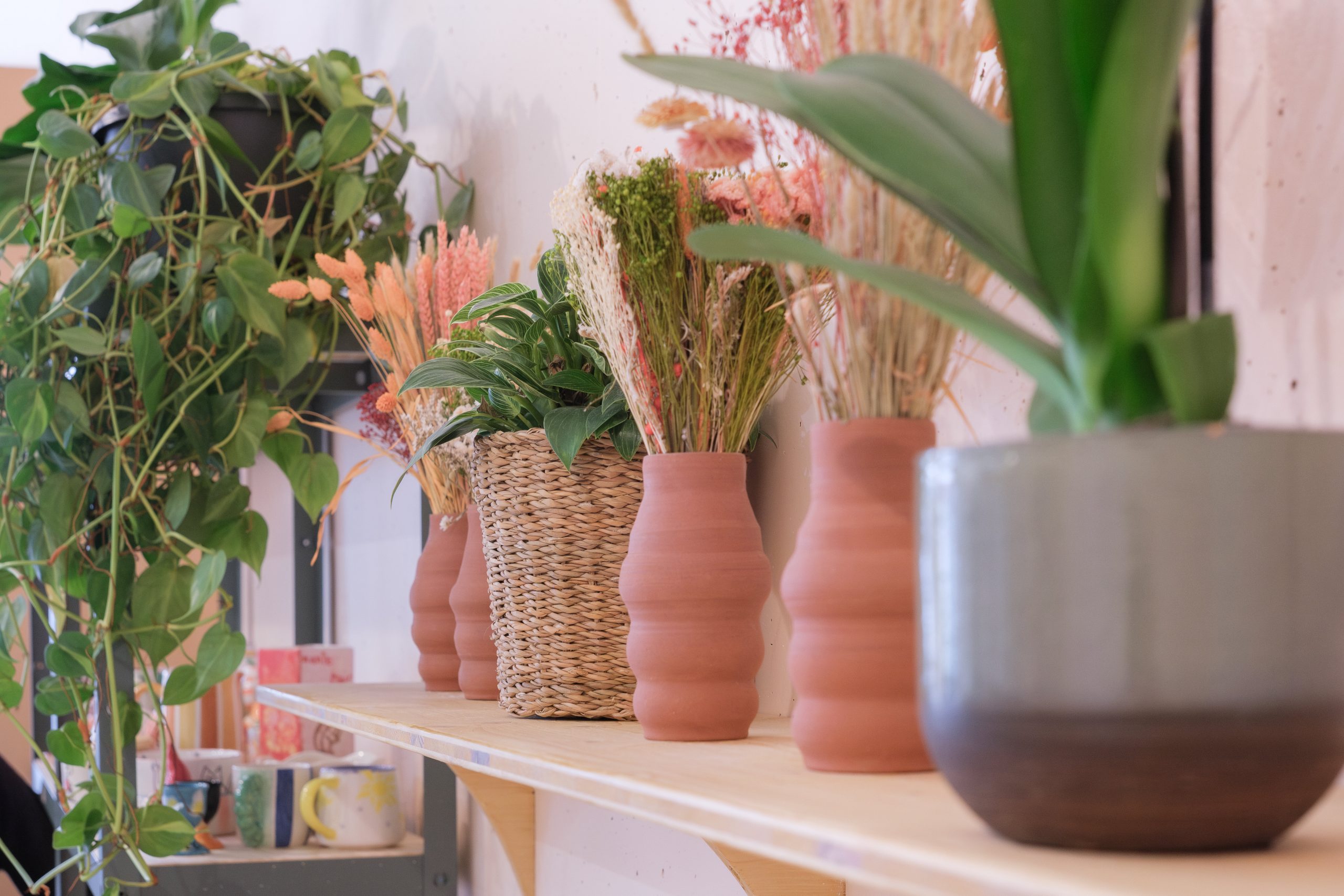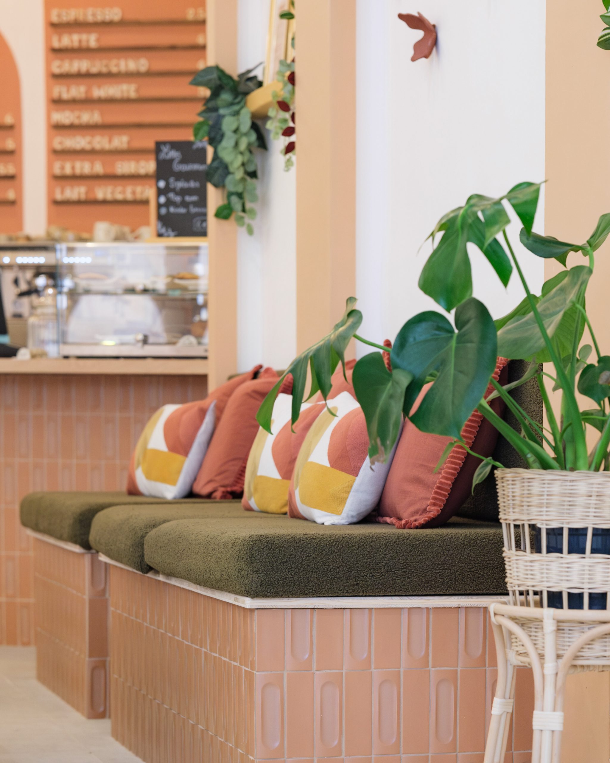 Dans l’espace accessible au public, un bar sur mesure, une banquette intégrée et des arches architecturales participent à la mise en valeur des créations en céramique et à la création d’une expérience client fluide et chaleureuse.